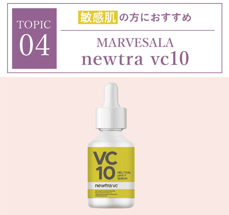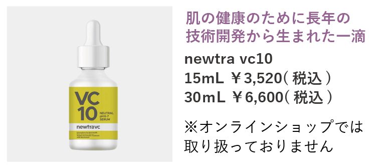 これまでのビタミンC美容液で、肌にピリッと刺激を感じてしまい、使うのをあきらめていた方には長年の技術開発から生まれた、中性で濃度10%の『newtra vc10』ビタミンC美容液がおすすめです。