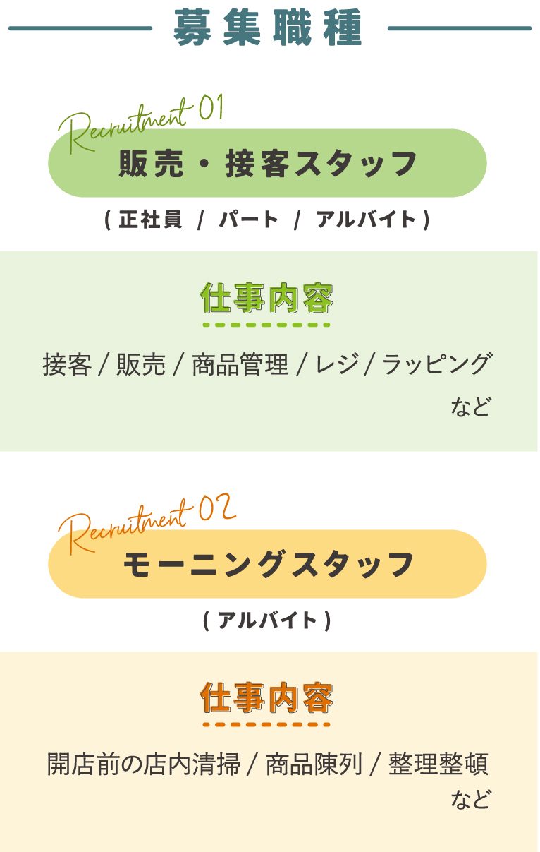 (2)(3)スタッフ割引、交通費支給(社内規定により)社員登用制度(パートのみ)