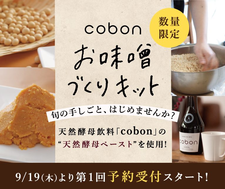 毎年大好評のお味噌づくりキットは、アミングで人気の天然酵母飲料『cobon(コーボン)』の“天然酵母ペースト”を使用します。