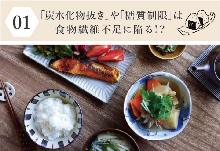 「ただ炭水化物を抜けばいい」ということではなく、炭水化物を減らすと、同時に食物繊維抜きにもなってしまうことを意識し、炭水化物を減らした分、他の食材で食物繊維を補うことを意識することが大切です。