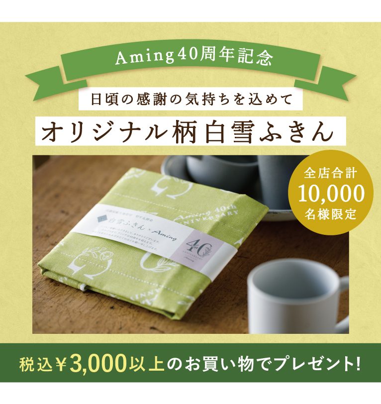 10月4日(金)より、¥3,000(税込)以上のお買い物で、全店合計10,000名様に先着で「Amingオリジナル柄白雪ふきん」を1点プレゼント!