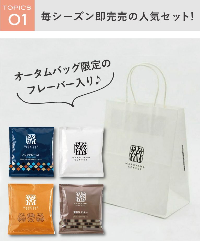 夏に大人気だった『丸山珈琲』の詰め合わせバッグが秋も発売決定!2,000円相当のとってもお得な「オータムバック」です。抽出器具をお持ちでなくても気軽に楽しめるドリップバッグ。丸山珈琲のバイヤーが世界中の農園を訪れ、厳選したコーヒー豆を独自の焙煎技術で焙煎。 ひとつひとつの工程にこだわり抜いた、スペシャルティコーヒーをお楽しみいただけます。