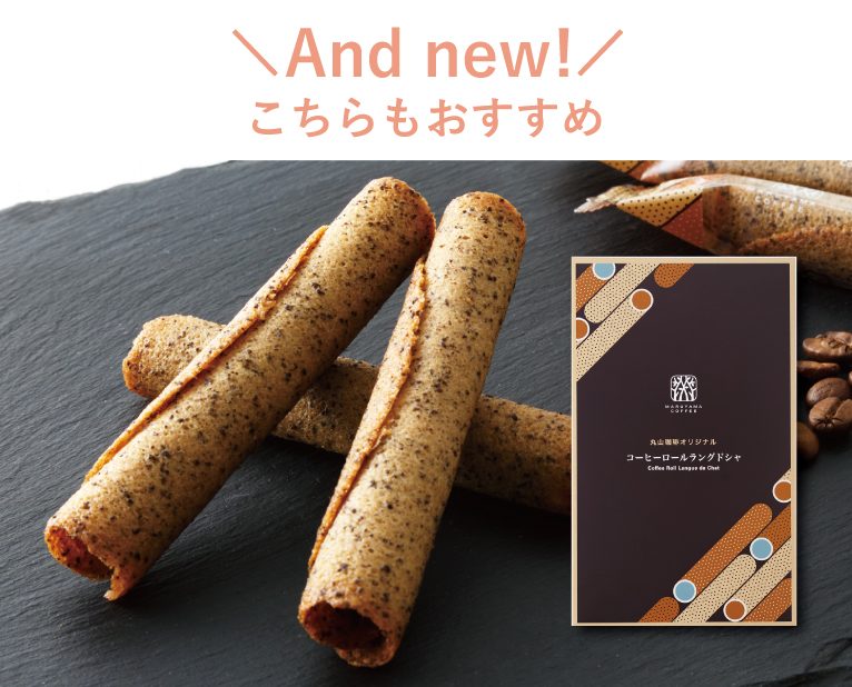 ティータイムのお共には甘すぎない「コーヒーロールラングドシャ」がおすすめ♪丸山珈琲のブレンドのコーヒーの粉をロールラングドシャ生地に練り込み、ロール特有のサクッとした食感はコーヒーの豊かな香りを引き立てます。