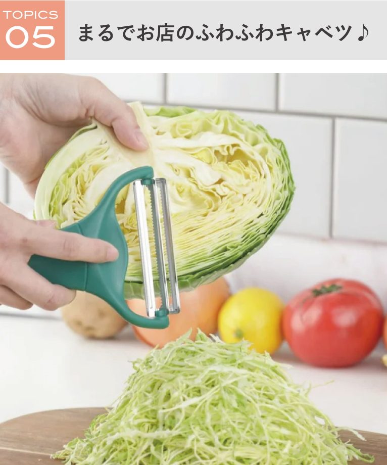 キャベツの千切りピーラーとしてだけではなく、皮むきやリボン状のサラダピーラーとしても使用可能です。ダイコン・ニンジン・タマネギなどにおすすめです。