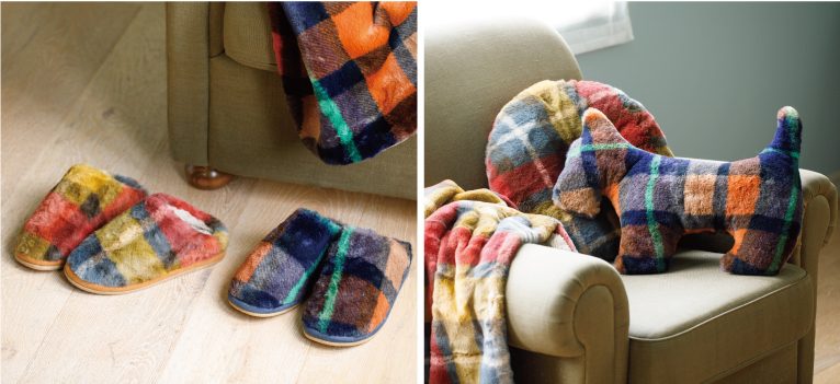 トラッドなチェック柄は男女問わず使いやすいデザインで、家の中で使うのはもちろん、オフィスやアウトドアシーンでも活躍!同じシリーズのスリッパやクッションとあわせてギフトにも♪