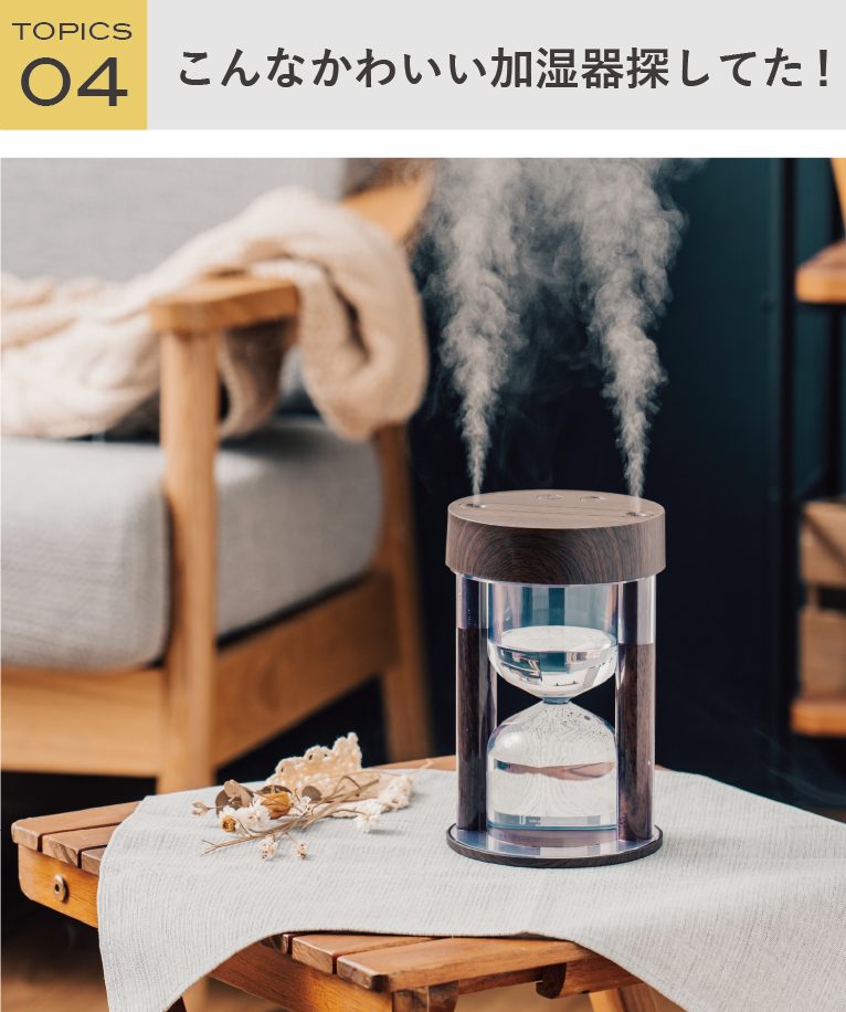 デザインと機能性を兼ね備え、お部屋をかわいく演出する「砂時計型コードレス加湿器」。オートオフ、4種の加湿モード&間欠運転モードで使いやすさも満点。ライト機能も搭載し、潤いとデザイン、光で快適空間をつくります。