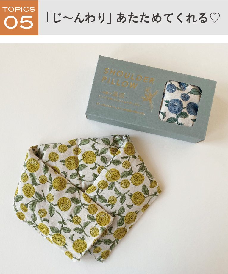 電子レンジで60秒ほどあたためて、冷えの気になるところに当てるだけで、緑豆の温熱効果が持続して体の芯までじんわりとあたためてくれる「ショルダーピロー」。