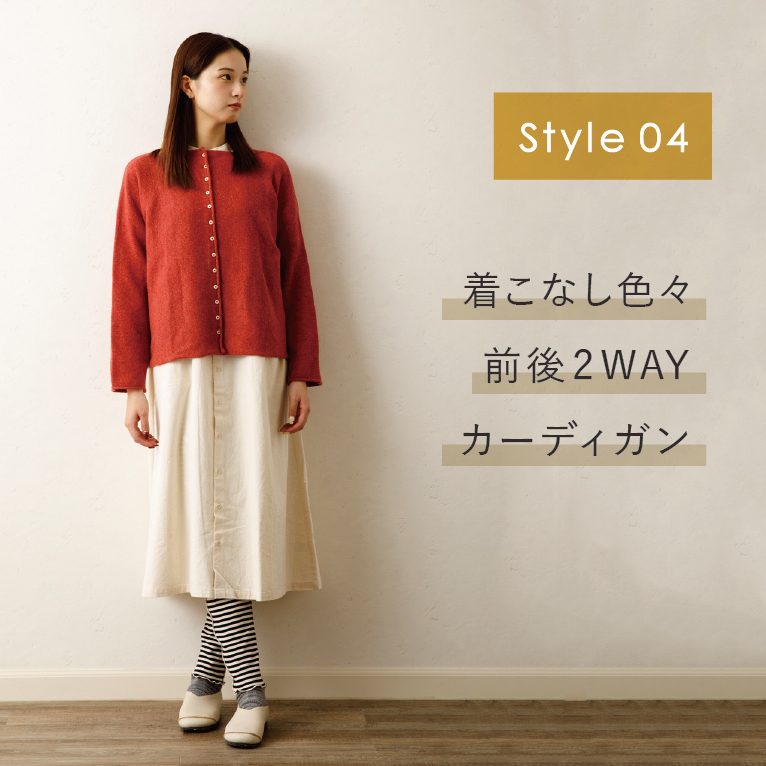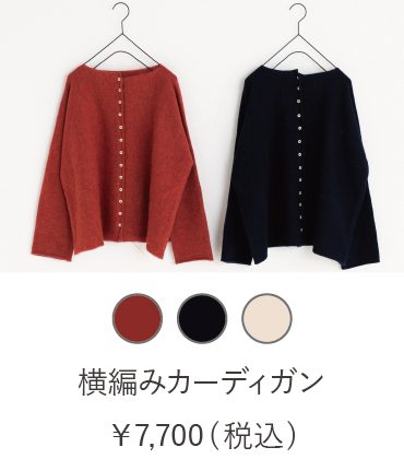 細かい釦がいっぱいついたデザインがかわいい、前後2WAY仕様の横編みカーディガンです。横編みを使用して、袖付けの接ぎ目をなくしたデザインが特徴です。編み端は少しカールさせて、全体が優しい柔らかな印象になるように仕上げています。釦を後ろにしてニットプルオーバーとしても、釦を前にしてカーディガンとしても着用できます。