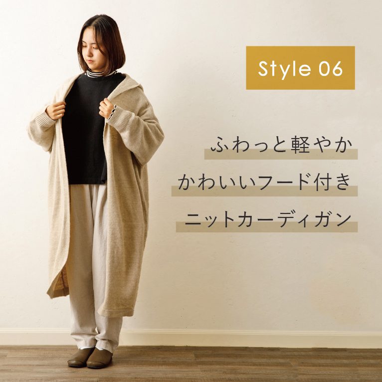 ふわっとしたブークレの糸を甘編みで仕上げた生地でつくったフード付きニットカーディガン。起毛感がありながらも、程良いシアー感のある編み目でとても軽くて柔らかいです。おうち時間やデスクワーク時など室内の羽織りとしても着心地抜群です。丈もたっぷり長めに、横幅もゆったり大きくしているので、横から見たシルエットもとてもかわいい、1枚羽織るだけでこなれ感が出るニットカーディガンです。