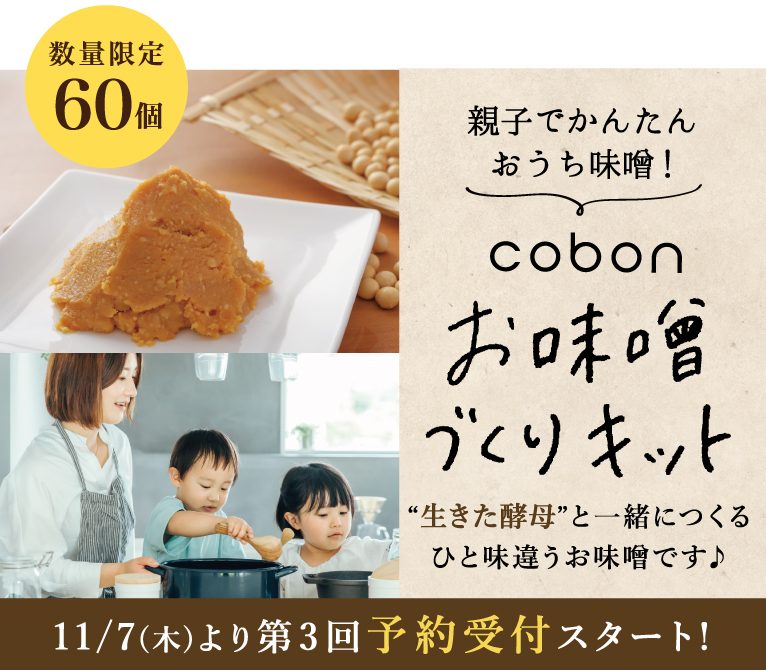 毎年大好評のお味噌づくりキットは、アミングで人気の天然酵母飲料『cobon(コーボン)』の“天然酵母ペースト”を使用します。