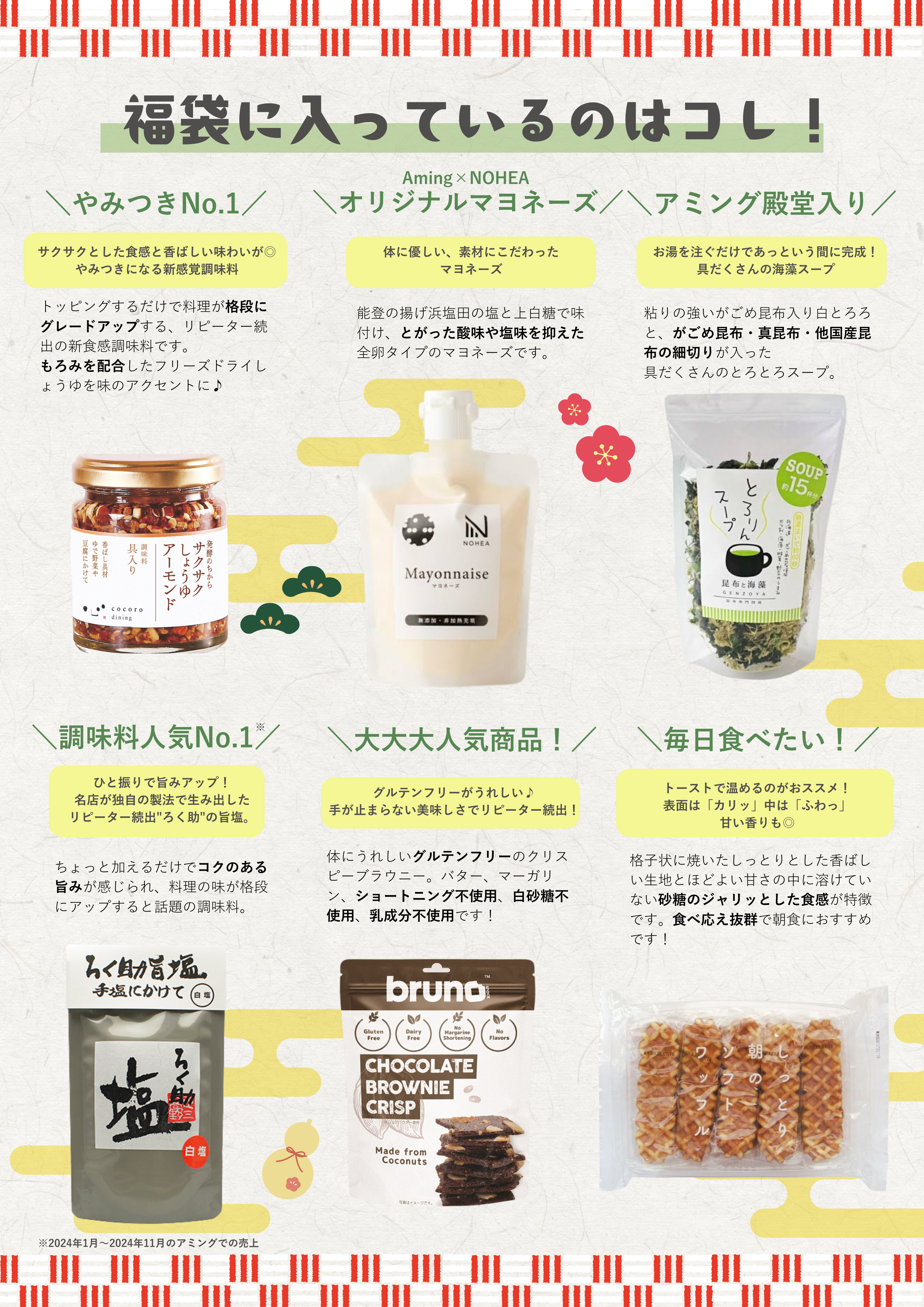 12/7(土)より、「もらってうれしい」「食べてやみつき」な2024年Amingヒットアイテムの食品6点を詰め合わせたお得な福袋の販売がスタート!