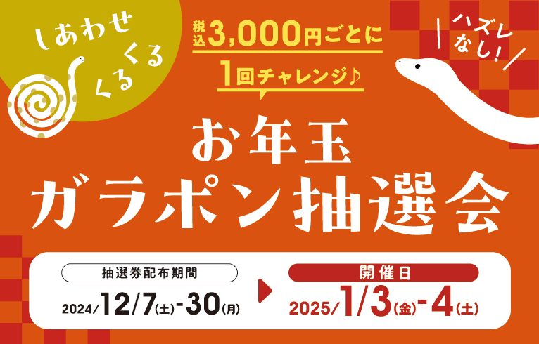 【抽選会開催日】2025年1月3日(金)・4日(土)抽選会当日も¥3,000(税込)ご購入ごとに1回、抽選会にご参加いただけます。※1枚のレシートにつき、チャレンジできる回数は最大10回まで