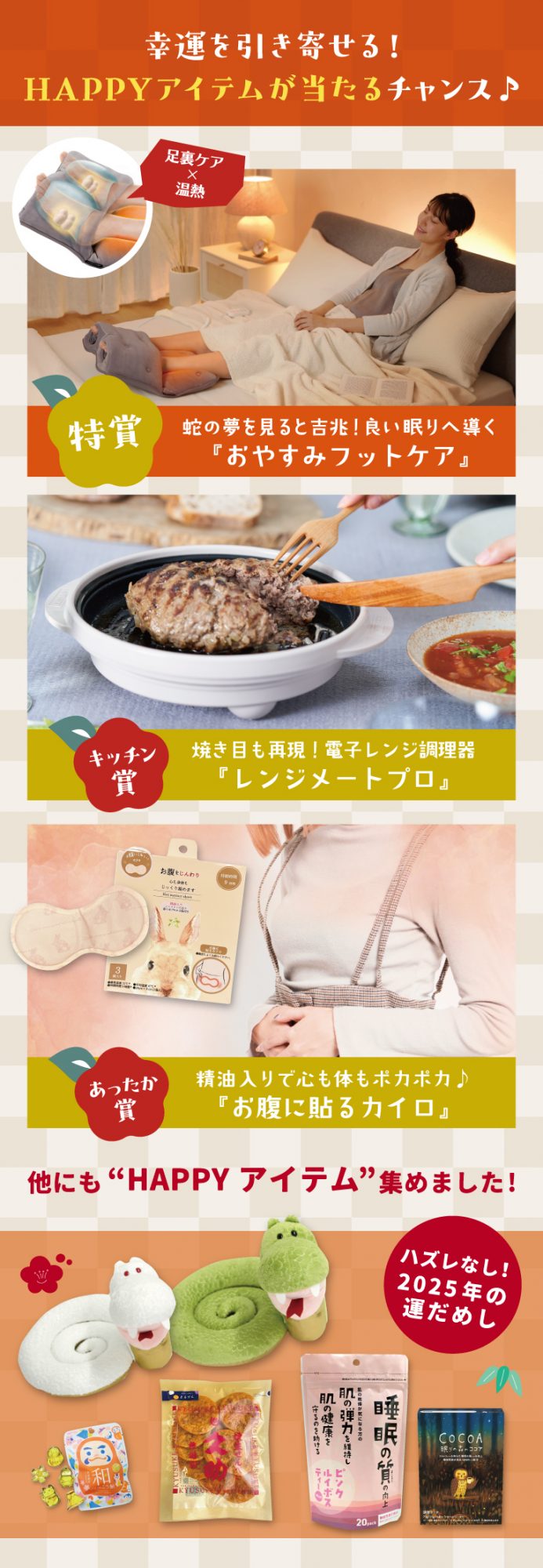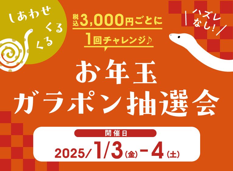 1月3日(金)・4日(土)の期間中、幸運を引き寄せると言われる巳年にちなんで、HAPPYアイテムが当たるガラポン抽選会を開催いたします。