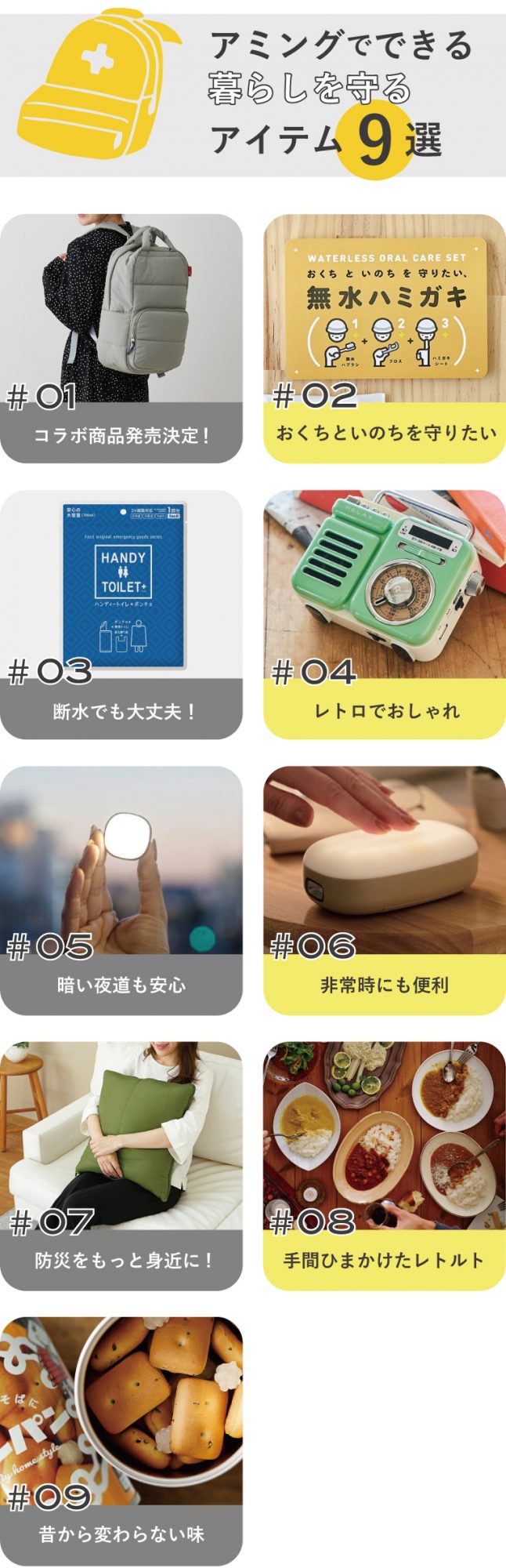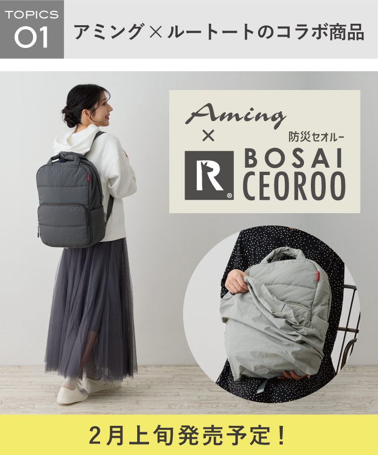「普段使いのバッグ、もしものときにも使えたら…」そんなつぶやきから生まれた「BOSAI CEOROO(防災セオルー)」。トートバッグ専門ブランドの『ROOTOTE(ルートート)』との共同開発商品です。雨や汚れもサッと拭き取りができるはっ水加工の素材に、雨よけカバーもついています。災害時には簡易枕やクッションにもなる優れものです。※発売は2月上旬を予定しています
