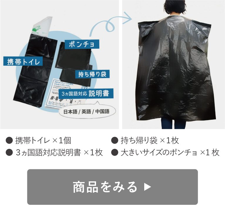 使い捨ての携帯トイレに、目隠し用の大きなポンチョがついた充実のセット