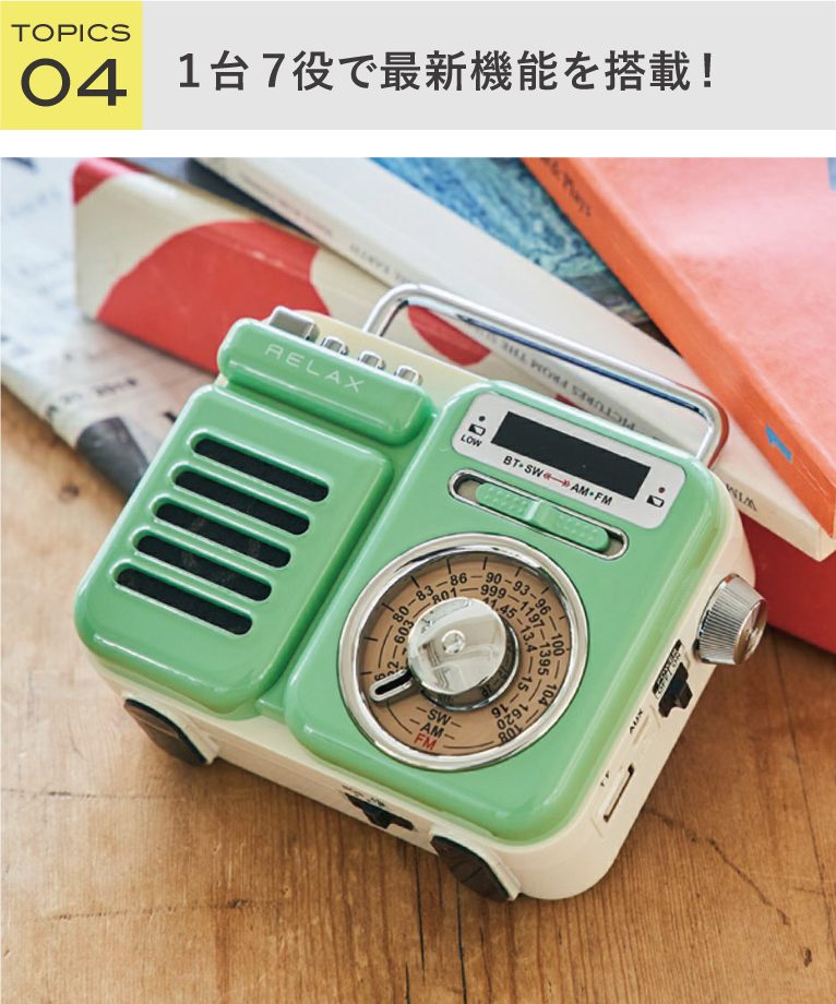 「マルチレトロラジオ」は1台で7役をこなす優れものの昭和レトロなラジオ。ラジオ、ライト、アラーム(SOS)、モバイルバッテリー、音楽再生、時計、スピーカーの機能を搭載。インテリア雑貨として、自宅ではラジオやBluetoothを使用して音楽などを楽しめ、屋外ならアウトドア用品としても◎手回し充電機能やSOSアラームがついているので、緊急時の防災用品としても役立ちます。