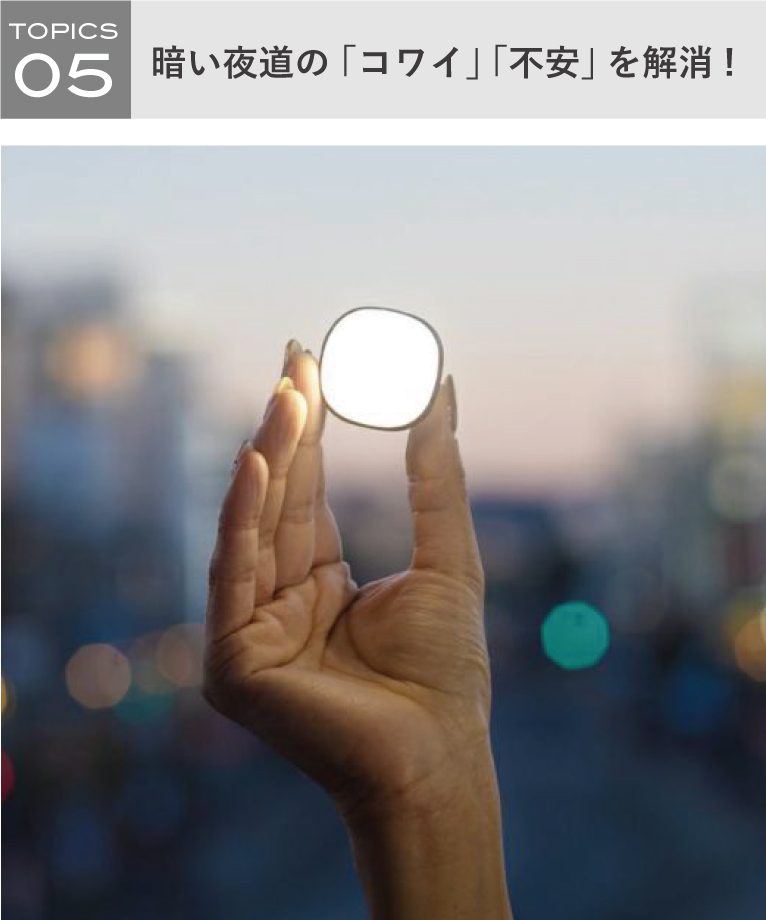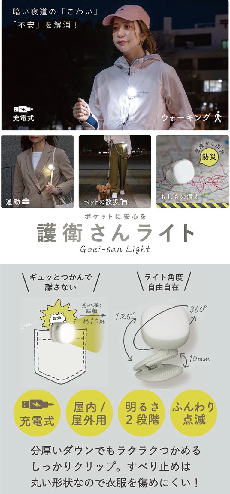いつでもどこでも光の「安心」を持ち歩いて欲しい思いを込めて、小さくてもしっかり明るいライトをつくりました。この「護衛さんライト」を身につけて、暗い夜道も快適に♪充電式で繰り返し使えて便利です。
