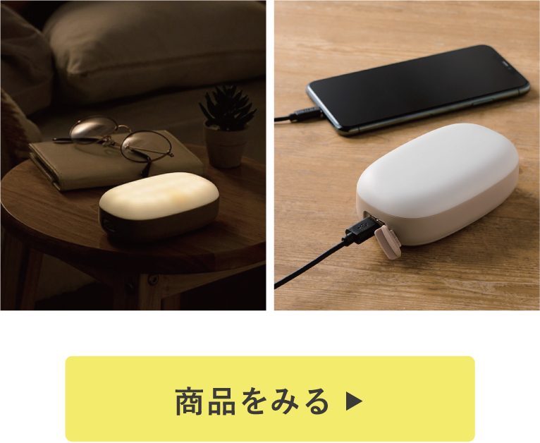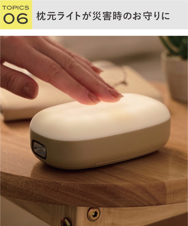 普段は枕元ライトとして、非常時は懐中電灯やスマホなどの充電器にもなるアイテム。ライトは3段階の明るさ調整が可能で、SOS点滅モードへの切り替えもできます。