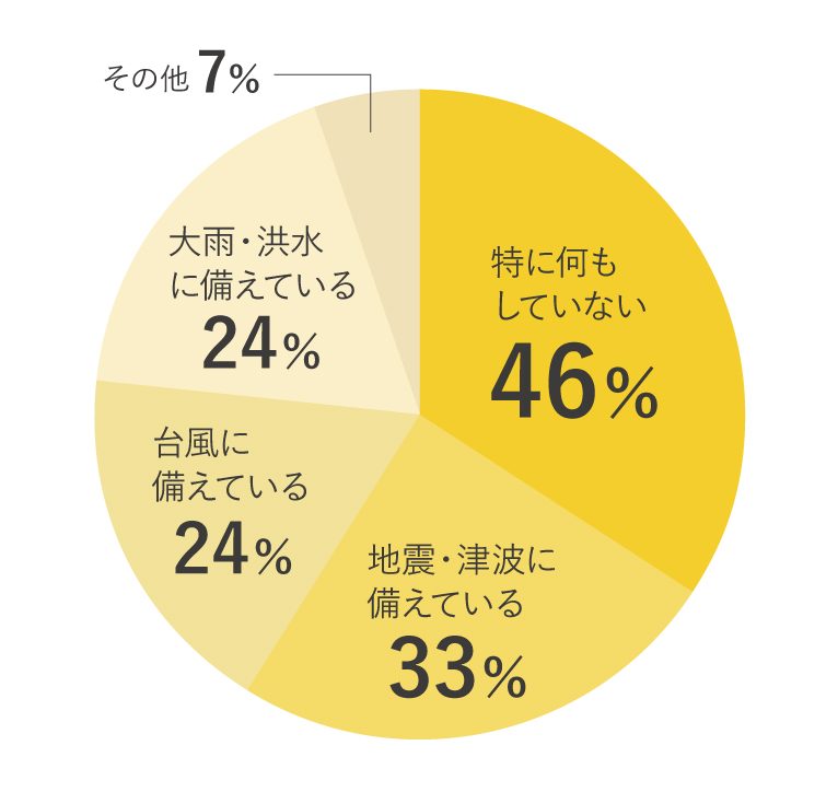 ◆おうちで自然災害への備えはしていますか?「自然災害の発生確率が高まっている」と感じる人は、70%以上いるのにも関わらず「対策をしている」と答えた人はまだまだ少ないのが現状。「何をしたらよいのか?」「どこで用意できるの?」など不安の声も多い。
