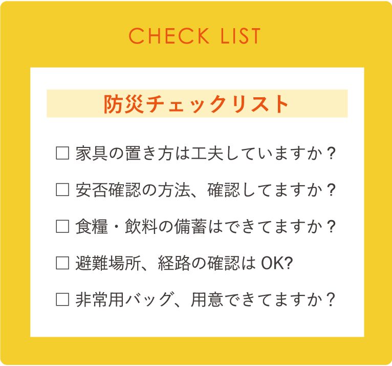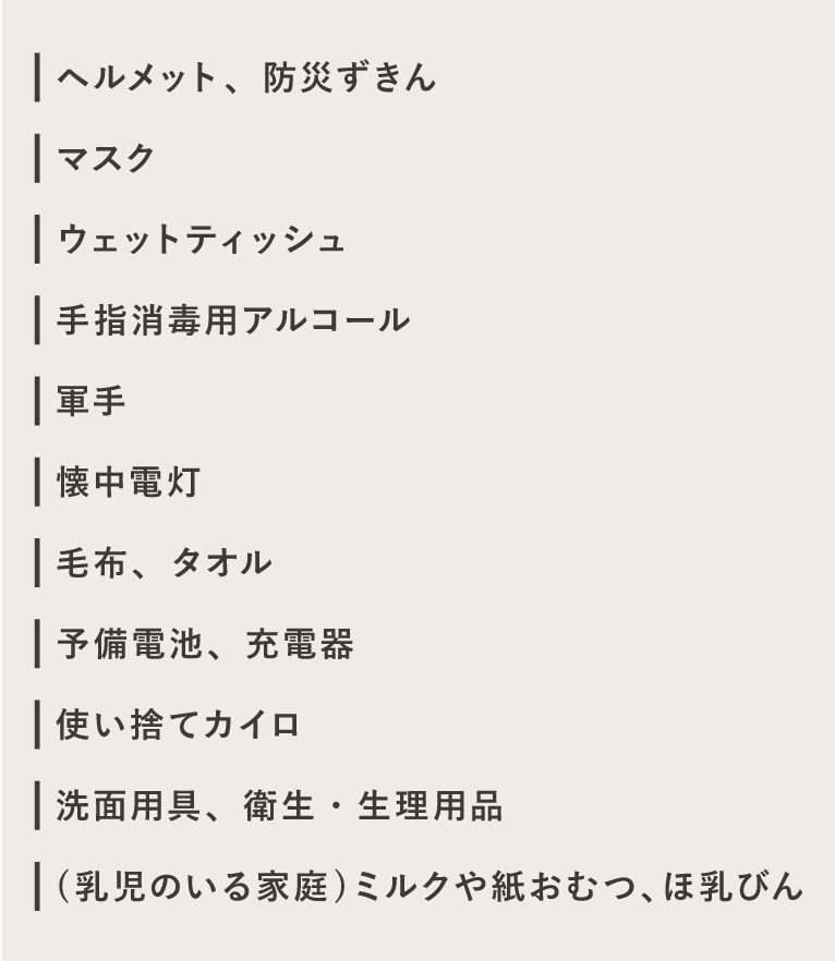 飲料水・非常食は3日×人数分用意し、下着、衣類、トイレットペーパー、ティッシュペーパー・マッチ、ろうそく・カセットコンロなども備えておくと安心です。他にも、以下のものを備えておきましょう。