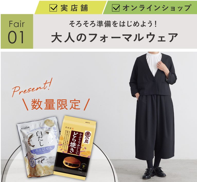 フォーマルウェア1点以上を含む対象商品を¥15,000(税込)以上ご購入で「しろえびせんorどら焼き」を1点プレゼント!