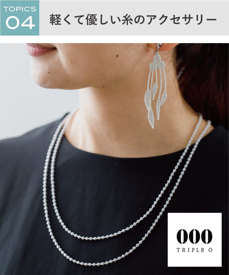 ラメ糸がキラリと光る、繊細な風合いが魅力的な『000(トリプル・オゥ) 』の「マイクロ・スフィア 120(ラメ) ネックレス」と「 Plants(プランツ)ピアス/イヤリング 」。