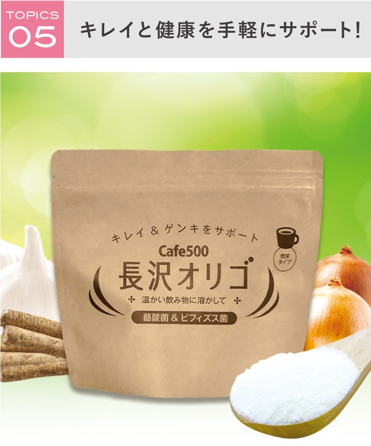 「長沢オリゴ」はゴボウ・タマネギ・ニンニクなどに含まれるフラクトオリゴ糖が主成分。フラクトオリゴ糖を摂ることで善玉菌のエサが増え、キレイと健康をサポートしてくれます。さらさらの粉末タイプで温かい飲み物にも溶けやすく、甘くないので食べ物の風味の邪魔もしません。毎日の食事や飲み物に混ぜて、手軽に摂取できます。