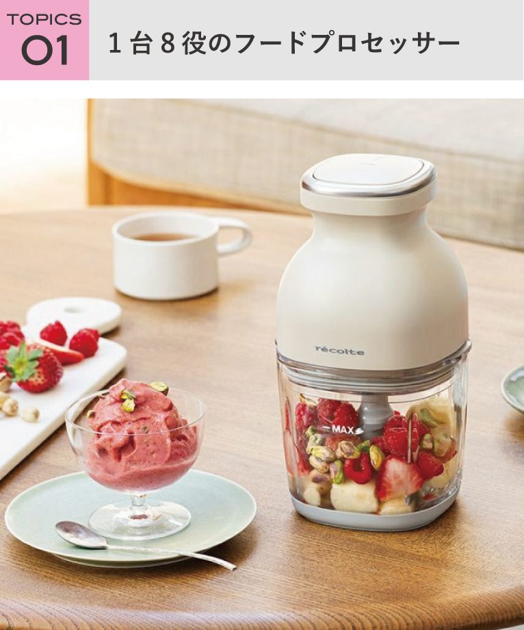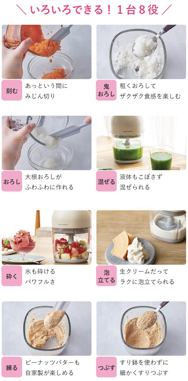 「recolte(レコルト) コードレスカプセルカッター ボンヌ」は、刻む・砕く・混ぜる・練る・潰す・おろし・鬼おろし・泡立ての1台8役がこれ1台で叶う多機能アイテムです!