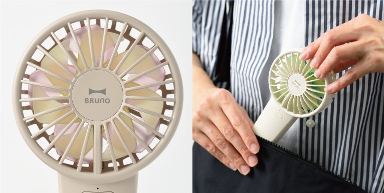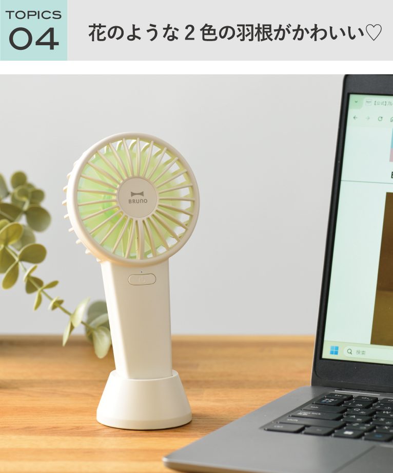 花をモチーフにした、重なり合う2色の羽根がデザインのポイント。シーンに合わせて選べる風量調節機能付きで、使い勝手も◎電源は長押し1秒でオンになる仕様なので、誤作動の心配もありません。
