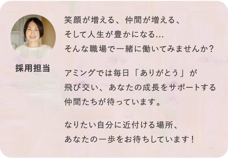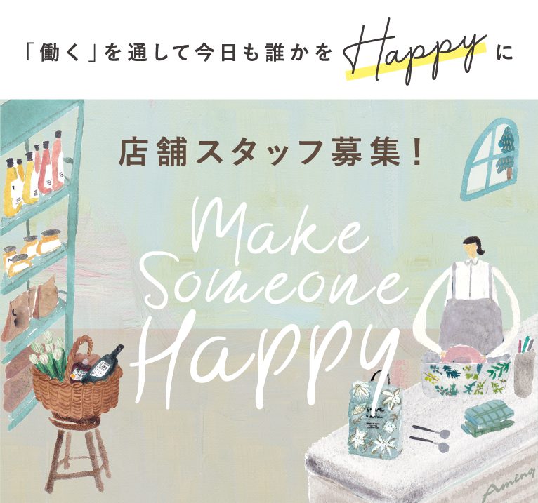 アミングでは「手に届く暮らしの幸せ」をコンセプトに、いつ足を運んでも新しいモノやコトとの出会いがあり、心がワクワクする。そんな「素敵」が溢れるお店づくりを一緒にしていく仲間を募集しています。
