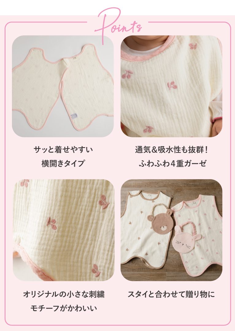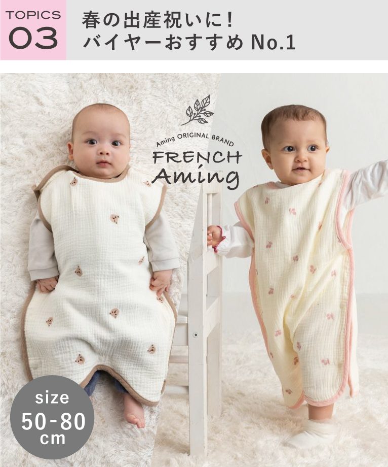 季節の変わり目の朝晩の冷え込みや夏場のエアコン対策など、ベビーたちには春夏もあなどれない寝冷え。体温調節が苦手なお子様も『FRENCH Aming(フレンチアミング)』の4重ガーゼのスリーパーが優しく包んでくれます。