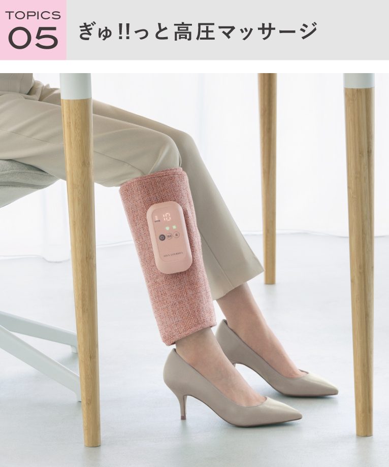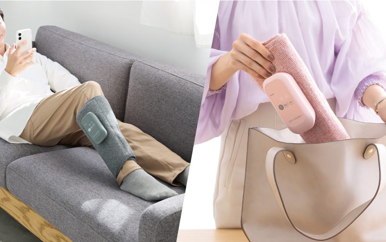 上下2層のエアバッグで力強くマッサージします。温熱ヒーター付きで、ひんやりした脚もぽかぽかに。オフィスや旅行にも持ち運べるコンパクトサイズです。