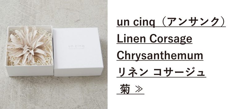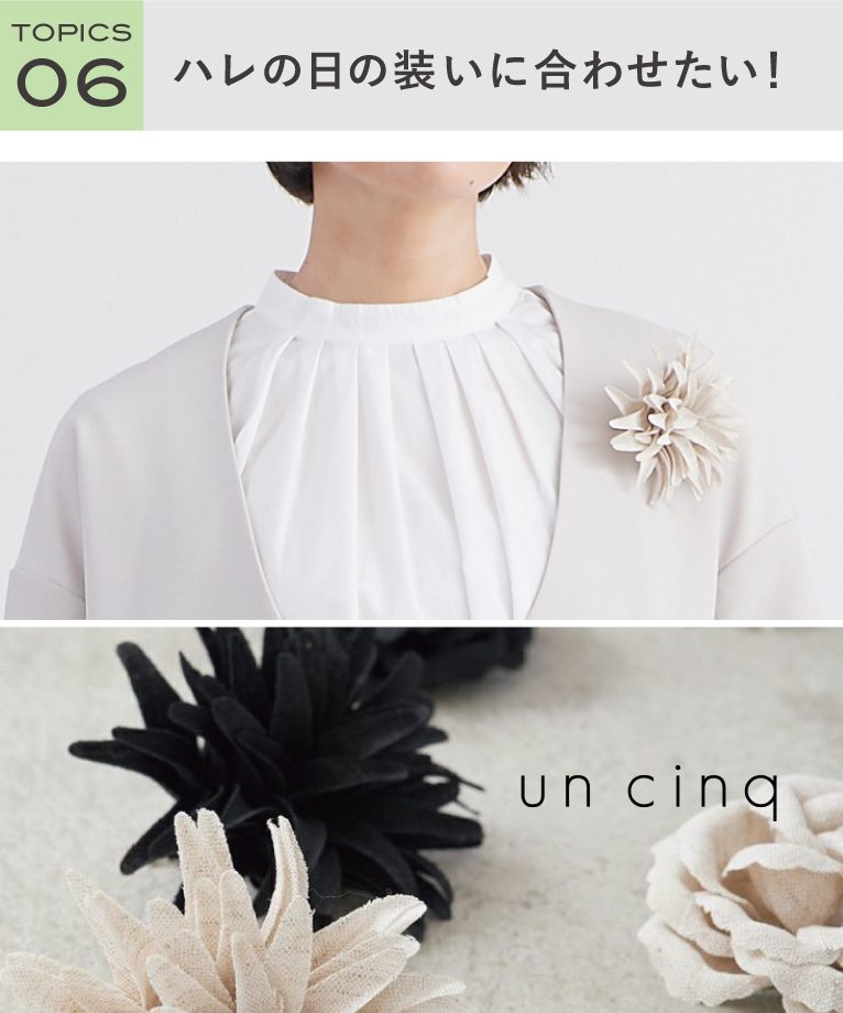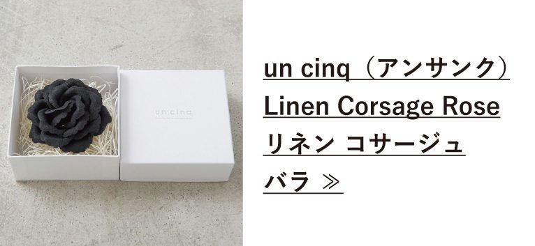 上質で仕立ての良い服を選んだら、次に目を向けてほしいのがコサージュなどのファッション小物。『un cinq(アンサンク)』 のリネンコサージュは、胸元が華やかになりハレの日感がグッと高まります。マグネット仕様で、お洋服に穴をあけずに装着可能なところも◎