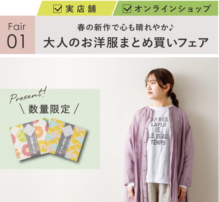4月は大人のお洋服を2点以上ご購入で「白雪友禅ふきん」を1点プレゼント!