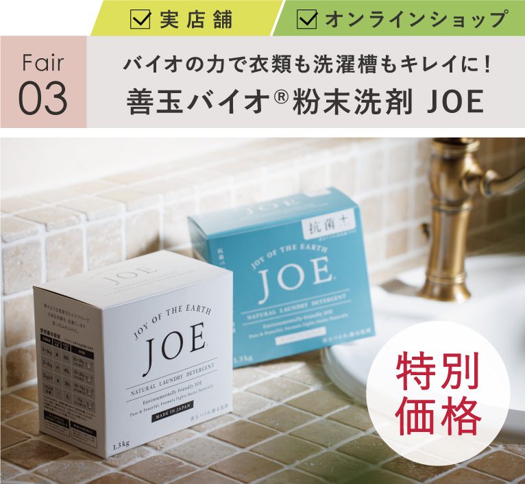 洗濯のプロも認める優れた洗浄力とバイオの力で様々な洗濯の悩みにアプローチする洗濯用洗剤「善玉バイオ(R)粉末洗剤 JOE」。キレイになった洗濯物に再び汚れを寄せ付けない“再汚染(※)防止力”や、界面活性剤をほとんど使わない肌に優しい成分などが魅力です。