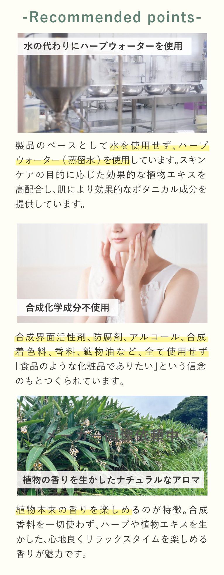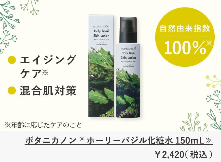 ホーリーバジルの自然な香りがふんわりとして、肌にスッと浸透する感覚が気持ち良く、年齢に応じたハリや弾力をサポートします。お手入れ時間をリラックスタイムにしてくれるほど良い香りです!