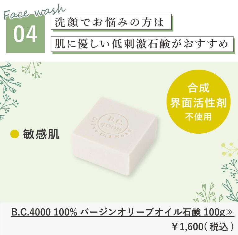 04 洗顔でお悩みの方は肌に優しい低刺激石鹸がおすすめ