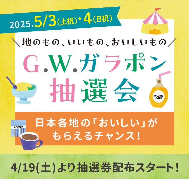【※この記事は過去の記事です】 【日本各地の「おいしい」が当たるチャンス!】5/3・4はG.W.ガラポン抽選会開催!