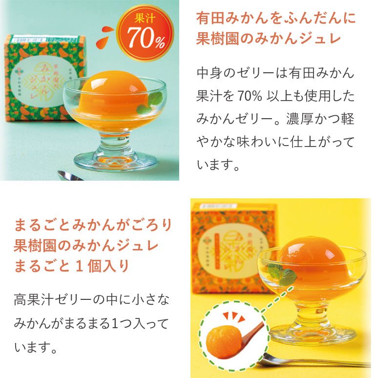 有田みかんをふんだんに使った『早和果樹園』の贅沢なみかんゼリーギフト「果樹園のみかんジュレ 4個セット」。みかんの美味しさがギュッと詰まったゼリーと、その中にみかんがまるごと1つ入ったおしゃれなサプライズゼリーの2種類を、2個ずつ楽しめるセットです。