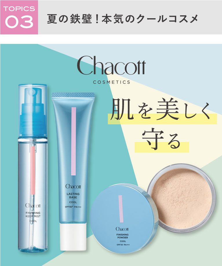 暑さにも紫外線にも負けない!『チャコット コスメティクス』の「クールシリーズ」。水分と反応して肌に清涼感とうるおいを与えるMPD(メントキシプロパンジオール)を配合し、ひんやりとした使用感で毎年ファンの多いアイテムです。