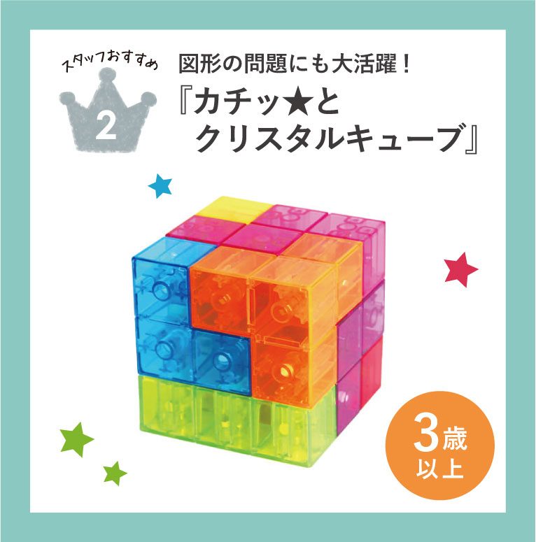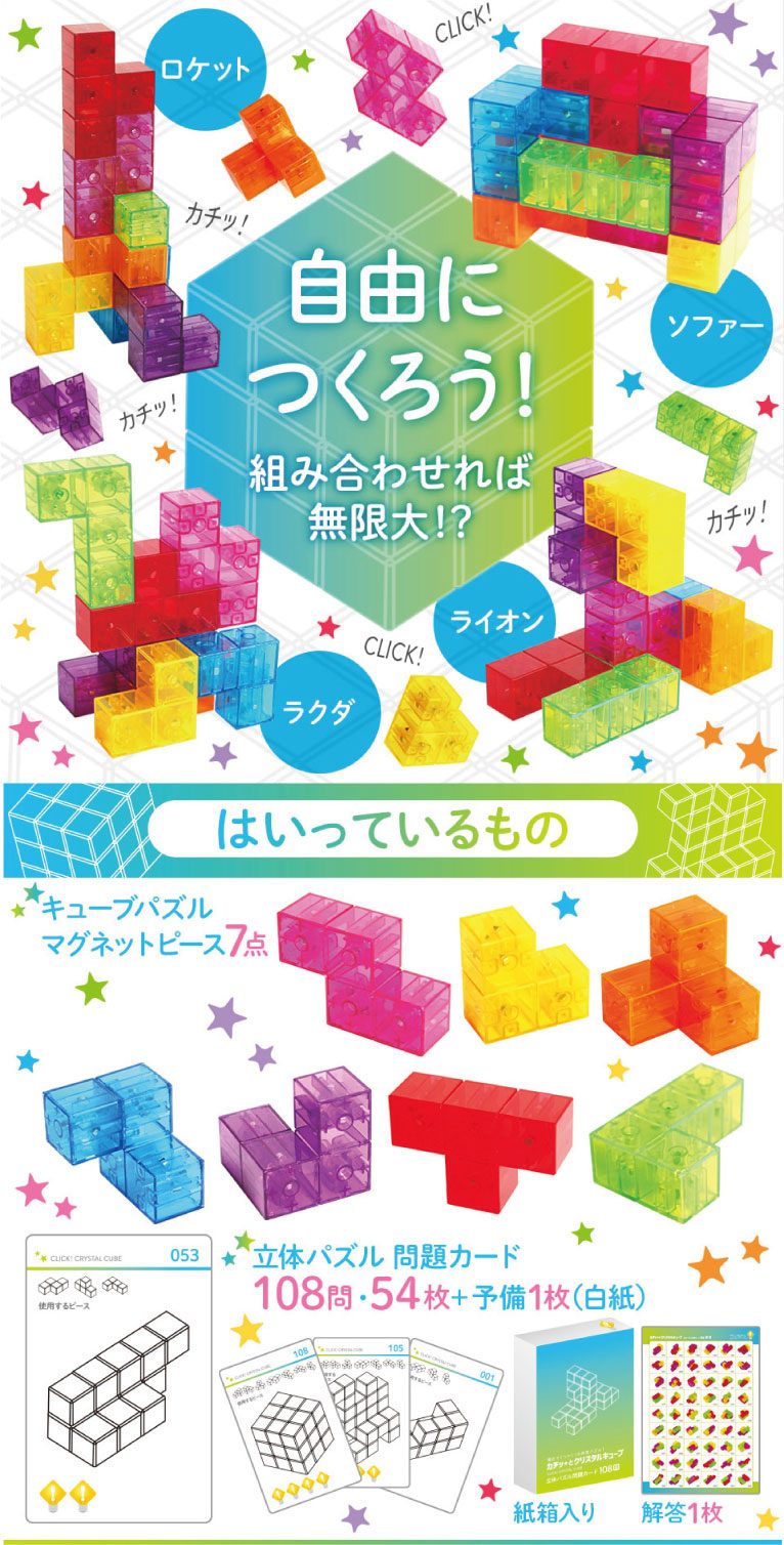 カチッ! がクセになる頭脳パズル「カチッ★とクリスタルキューブ」。磁石どうしの反発がなく、どの向きでも「カチッ」とくっつく!シンプルな7つのピースを向きを変えたりひっくり返してカチッとくっつけて無限の組み合わせで自由につくろう!