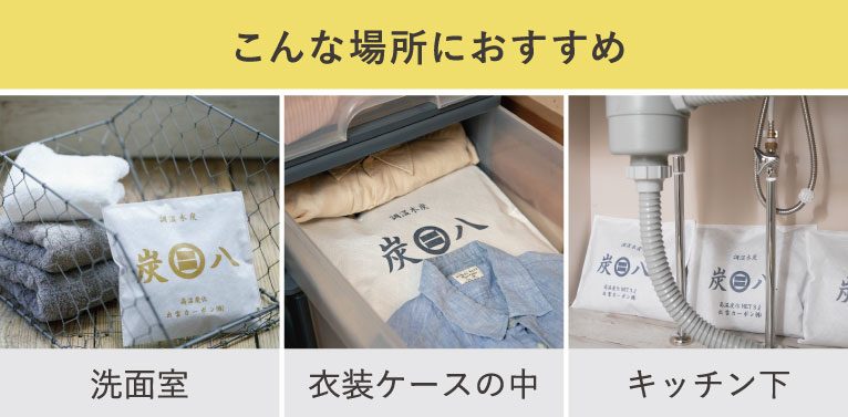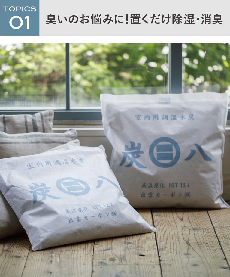 『炭八』は湿度の高い島根県出雲で生まれた調湿用の炭。湿気の吸湿量、スピードが一般的な備長炭の2倍はあり、お部屋のじめじめや気になる臭いを解決します。室内に置いたり、押入やベッドの下に使用することでカラッと快適にお過ごしいただけます。
