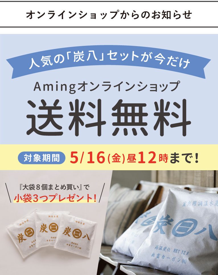 『炭八』が、期間限定で送料無料キャンペーン中!除湿器いらず、半永久的に使える省エネアイテムです♪ 寝具が干せない季節には、ほんとに便利!お得なこの機会をぜひご利用ください♪