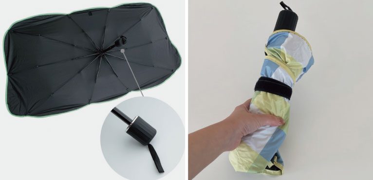 日差しが強いときのために車に積んでおきたいサンシェード。車内の温度の上昇を抑える効果があり、傘のようにパッと広げて簡単に設置でき、使用後はスリムに折り畳めるのでかさばらないのもうれしいポイント♪