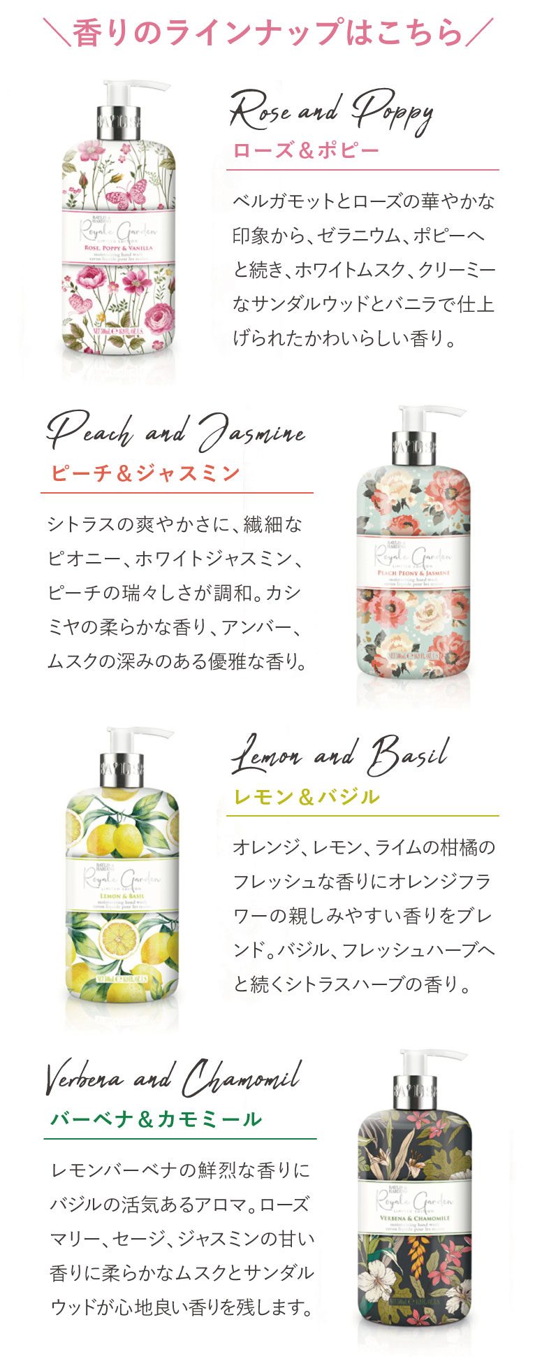英国ブランド『BAYLIS&HARDING(ベイリス&ハーディング)』からハンドウォッシュが入荷しました!厳選した素材でつくられていて、手を洗うと自然の香りが豊かに広がり、イングリッシュガーデンを散策するようなリラックス空間を演出します。