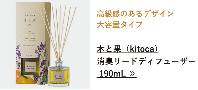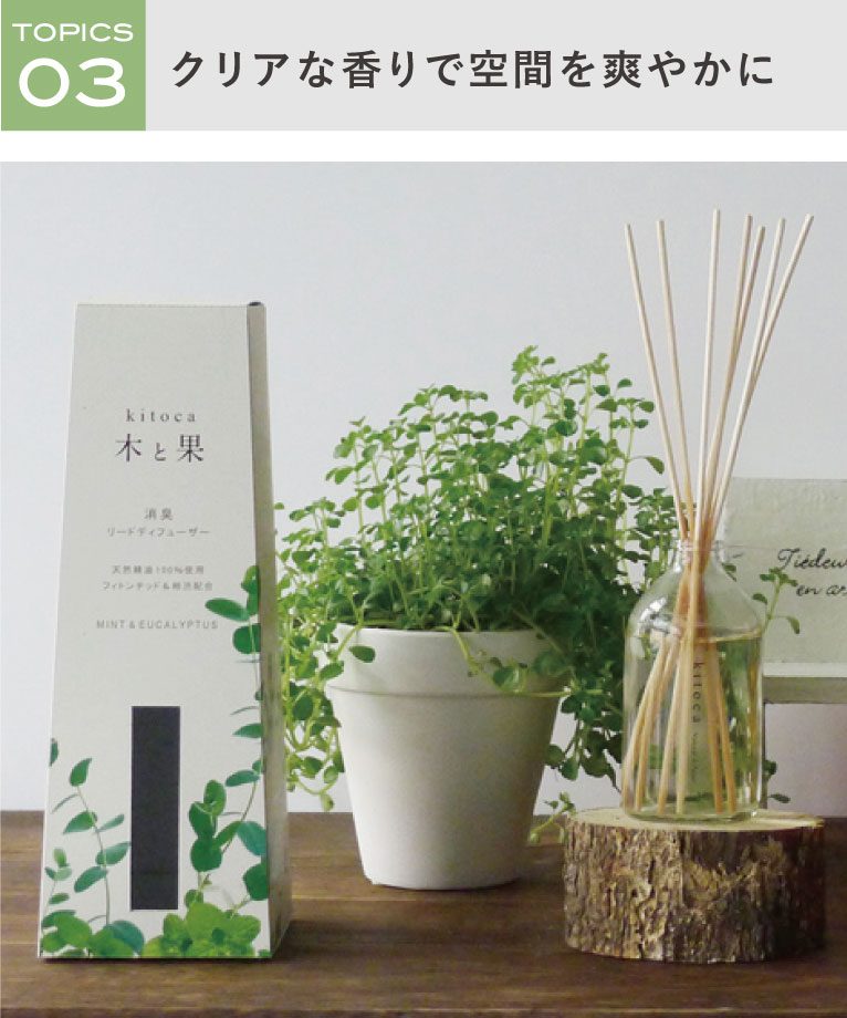 天然精油を100%使用し、自然の香りをギュッと詰め込んだ、ナチュラルな香りの「木と果 消臭リードディフューザー」。樹木から取れるフィトンチッド(※)と柿の実から取れる柿渋の2種類の消臭エッセンスを使ったリードディフューザーです。