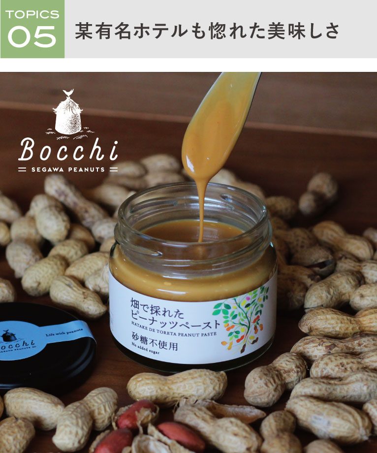 『Bocchi』の「畑で採れたピーナッツペースト」は、土から掘り起こした落花生を約1ヶ月、機械を使わず畑の上でじっくりと自然乾燥させた後、手作業で手剥きされ、ペーストに加工されます。その味は某有名ホテルやブーランジェリーも惚れた美味しさ!