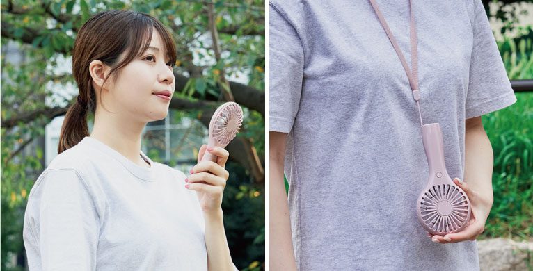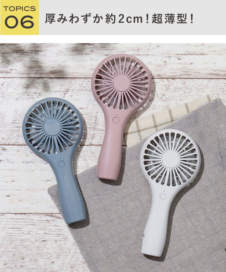 本体の厚みがわずか約2cmの超薄型設計のハンディファン。7枚の羽根が、コンパクトなボディからは想像できない十分な風量を実現。3段階の風量調節に加え、リズム風も搭載し、使い勝手も◎