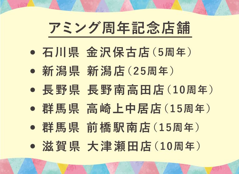このたび、アミング6店舗がそれぞれの周年を迎えることとなりました!5周年~25周年と年数はそれぞれ異なりますが、ここまで続けてこられたのは、地域の皆さまと日々アミングをご愛顧くださるお客様のおかげです。心より感謝申し上げます。