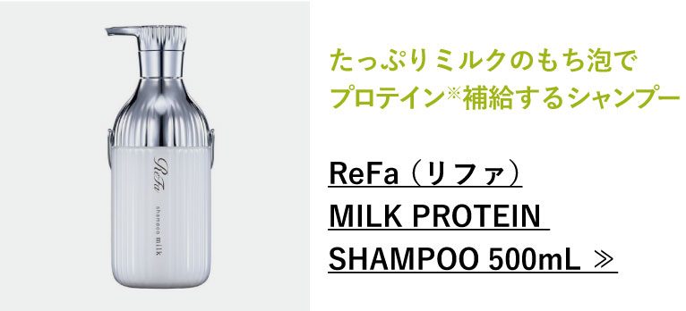 私たちの髪は、なんと80%がタンパク質。髪にもタンパク質が必要だということが重要視されはじめています。リファは、毛髪によくなじむ天然ミルク由来のプロテイン(※)に着目し、毎日のシャンプーで潤いを補充して“とぅるん”とまとまるなめらかな指どおりの髪へ導きます。さらに、トリートメントで内部だけでなく毛髪表面もしっかりと立体補修。毛先まで重厚感のある、なめらかな手触りに仕上げます。
